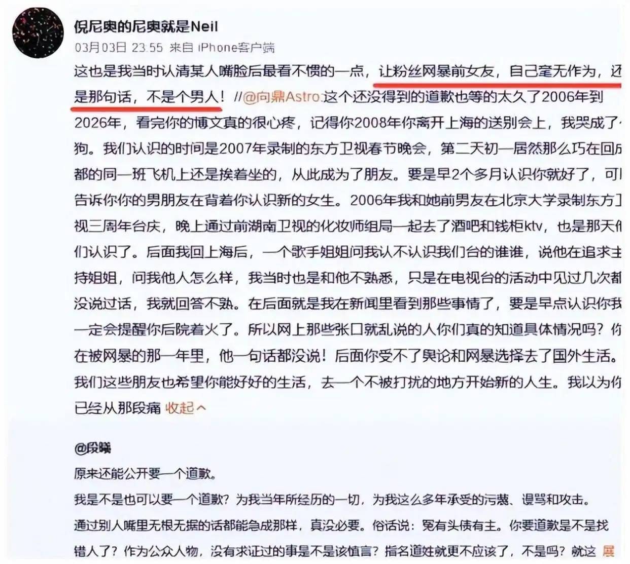 时间一晃就十几年。到了2025年底到2026年初 谢娜因为别的事在节目里怼薛之谦,要他道歉。舆论一下子炸了。段曦沉默了那么久,终于在社交平台上发了一句:“原来公开要道歉 是可以的啊。” 就这一句,戳中/p>